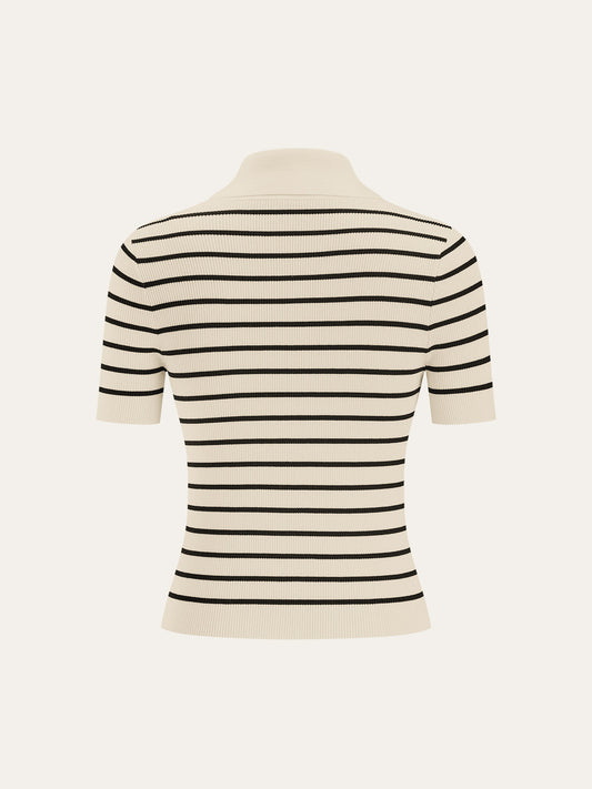 Striped Short-Sleeve Polo Collar Knit Cardigan