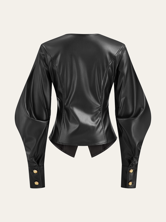 Metal Button Puffed Sleeve PU Leather Jacket