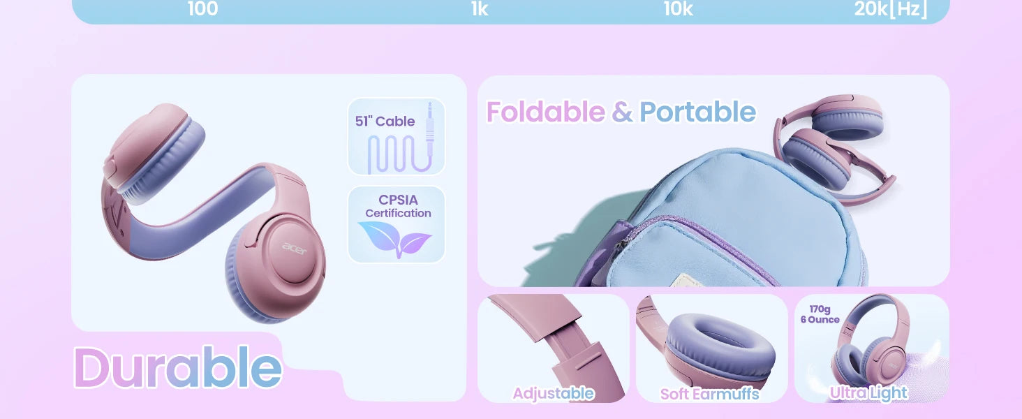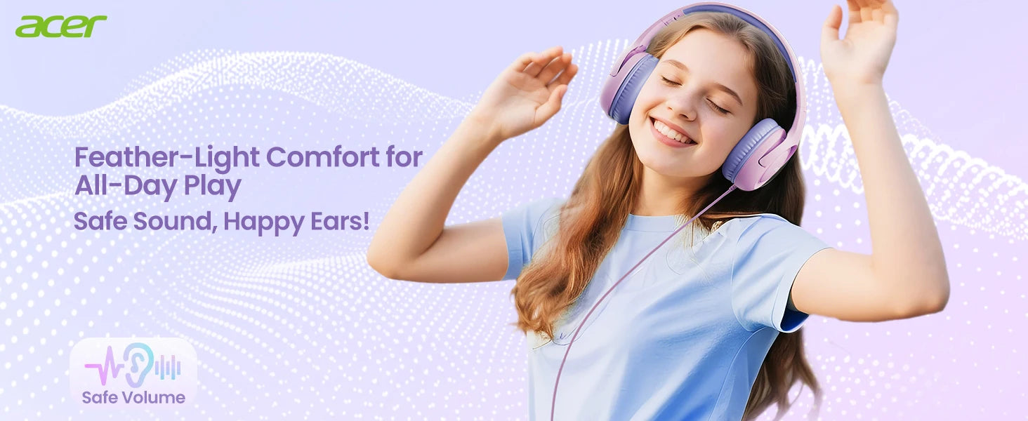 Acer HK03 Kids Wired Headphones for School 85/94dB Volume Limiter 3.5mm Jack Foldable Stereo Sound Headset for Girls Boy Gifts