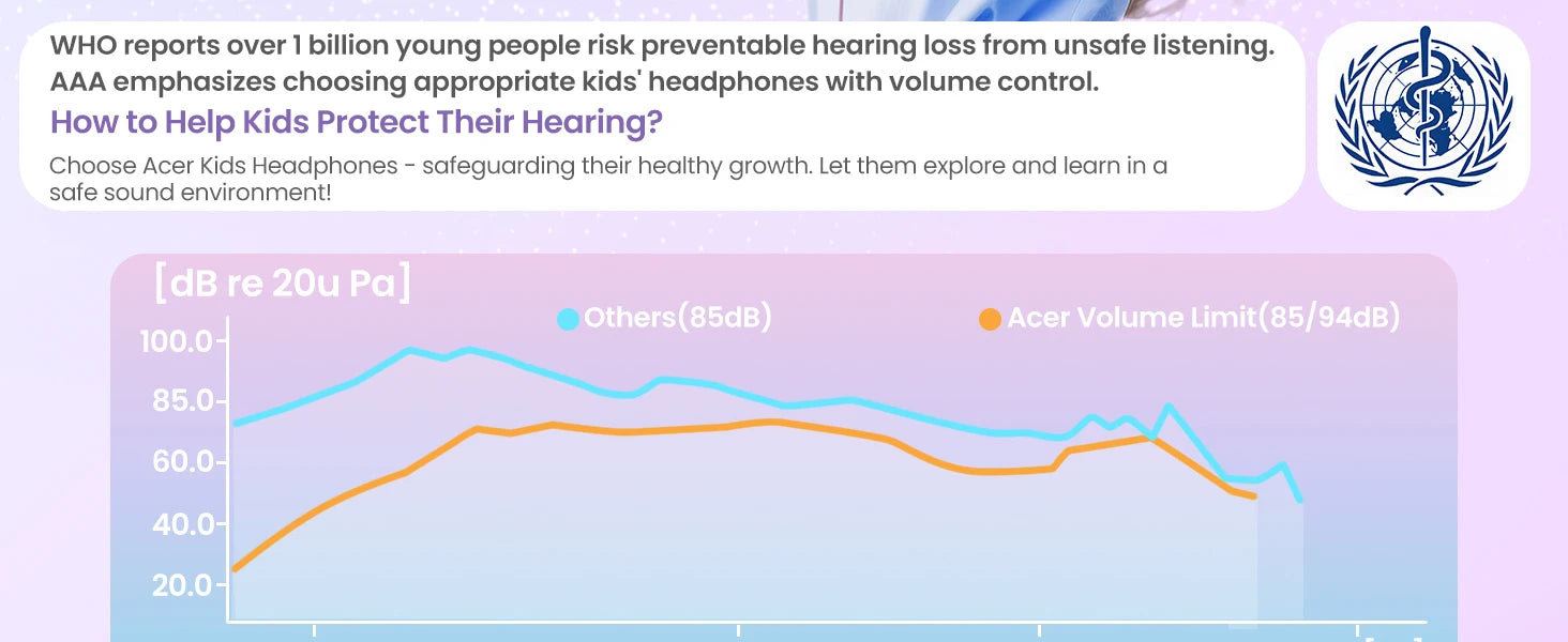 • Dual Safety Mode 85/94dB : Kids headphones for school protect young ears with volume control Designed to meet strict US market regulations, our headphones feature a built-in volume-limiting technology (≤85dB) to safeguard kids' delicate hearing, preventing long-term damage from excessive noise. Perfect for school, travel, or home use, giving parents peace of mind while kids enjoy their favorite content.