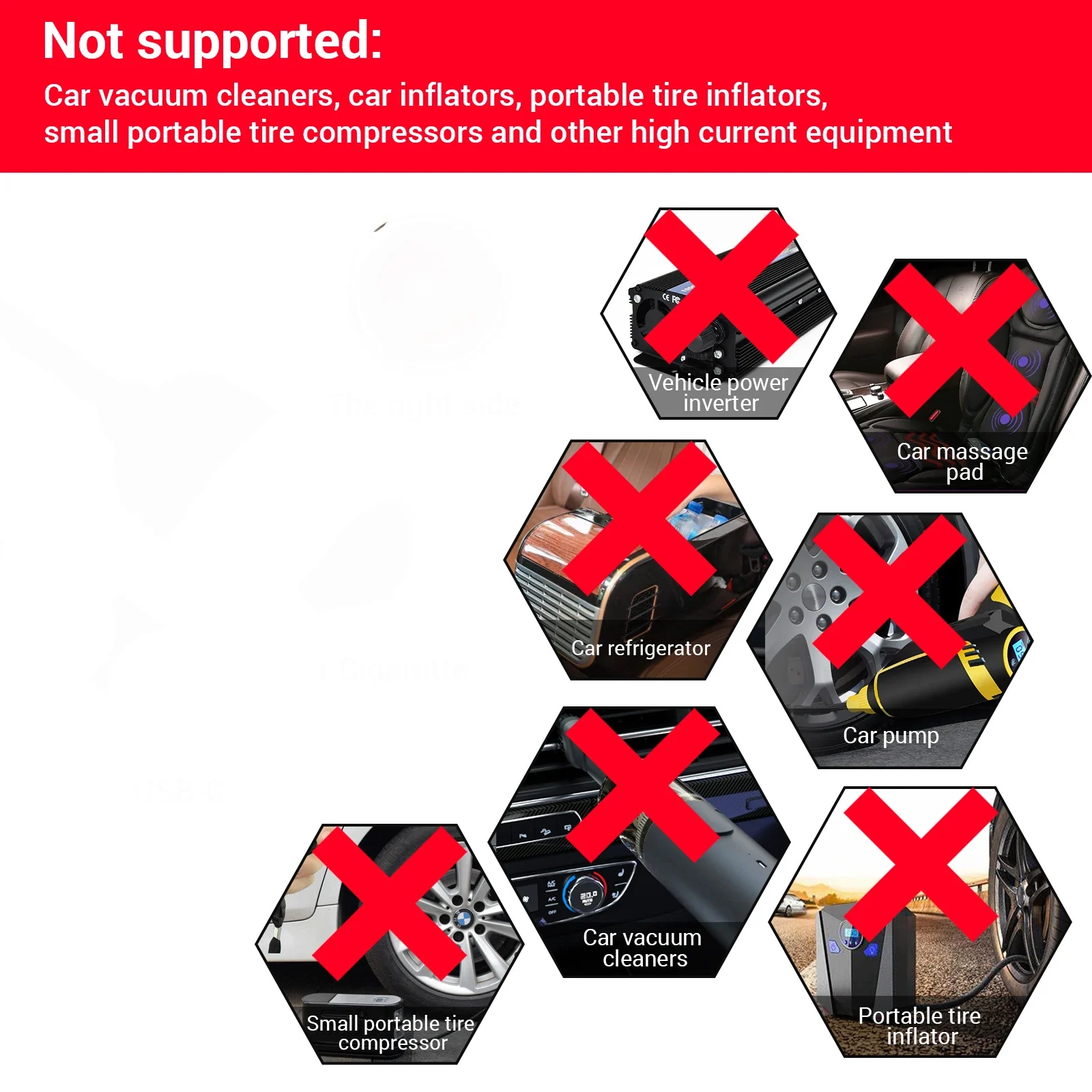 The converter is not suitable for car air pumps, electric jacks, car vacuum, power inverter, tire inflator, compressor, Pump, car refrigerator, heated seat, car cleaners ,In order to ensure efficient power supply of the output device, it does not support devices higher than 12V 10W